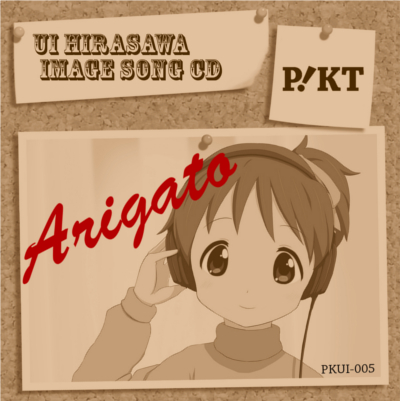 【作品詳細】 Ui Hirasawa Image Song CD『Arigato』(PKUI-005) 2曲入りシングル盤(音楽CD-R) 1. 1年と2ヶ月と25日 (リマスタリング ver.) 2. answer 作詞、作曲、編曲:やぱぱ (パニック!キッチンテーブル) ジャケットイラスト:びんご (LikeRoad) 《作品概要》 実は、前回の冬コミにて新刊としてリリースした『若葉萌ゆ』を最後に、一旦は『けいおん!』ジャンルから卒業しようかと考えていました。 原作が終わり、映画版も終わり、3期の制作発表もなく暫く経ちました。ずっと『けいおん!』ジャンルで活動していきたいと思う反面、これ以上創作を重ねていくと本来の「憂らしさ」からどんどんかけ離れていってしまうのではないかというジレンマを感じはじめていました。1作目『We』がだいぶ創作的な要素の強い「イメージソング」的内容だったのに対して、以降の作品がどちらかというと「キャラクターソング」の性格を強くしていったのは、このためです。 『若葉萌ゆ』の3曲目「USUAL」の歌詞中にて、「♪日常はきっと/形を変えたとしても/消えないで残ってく/また新しく生まれて/ずっと繋がっていく/ずっと続いてく」と書いたのは、『けいおん!』というジャンルを愛することから縋ることに変わっていく過程にいる自分を、たしなめる意味でもありました。 しかし、原作やアニメ版にて未描写であり、かつ補完してあげたいテーマがひとつだけありました。それは、「憂の卒業」です。これは、「学校からの卒業」というよりはむしろ「お姉ちゃんからの卒業」についてです。1作目『We』とも相通づるテーマではありますが、あのとき「保留」と表現したものを更に推し進めて、時が経った憂が当時のことを振り返って、つまりは「お姉ちゃんから卒業後の憂」視点で「卒業」というものを描きました。 ここまでを正しく理解していただけている方はもうお察しかとは思いますが、「サークルとして『けいおん!』からの卒業」を重ねて表現しています。ずっと好きでいる気持ちを大切にしていくことは、とても素敵なことだと思います。ですが、それが固執になってしまい、それ以外を楽しむことができなかったり拒んでしまったとしたら、それは果たして愛と呼べるのだろうか? という問題提起を含んでいます。 お姉ちゃんとの別れを描いた1作目からテーマを引っ張ってきているため、笑顔が素敵な憂という要素が殆ど含まれず、むしろ悲観的な女の子みたいに映ってしまうかもしれませんが、そのあたりはそういったテーマの同人誌を読んでいるような心持ちで受け取っていただければと思います。 アルバムタイトルの『Arigato』には、存分に楽しませてもらった『けいおん!』という作品に、大好きな『平沢憂』という女の子に、そしてこれまで当サークルが制作してきた一連の平沢憂イメージソングという表現受け容れてくださり、フォローしてくださってきた皆様への「ありがとう」の気持ちを込めています。 1. 1年と2ヶ月と25日 (リマスタリング ver.) 1作目『We』のコンセプト的部分を担う一曲の再録で、「お姉ちゃんとの別れに葛藤する憂」がテーマになっています。 この曲をベスト盤『EVER ONWARD』に収録しなかったのは、1作目を表現するために重要なパーツではあっても、憂に憂いてもらわなければいけなかった曲であるが故に本来の「憂らしさ」から少し外れてしまっていたためです。それが逆に、今回の「卒業」というテーマにはなくてはならないものとなり、1作目を聴いてくださっていない方にもテーマ性が伝わりやすいようにとの配慮もあって、リマスタリングver.として再録という運びになりました。 「唯が大学進学を機に実家を出て寮生活になることがわかった憂は、これまでずっと一緒に暮らしてきた姉との別れをどのように受け容れたのか」を想像して描いたもので、当時原作でもアニメ版でも描写されなかった部分の補完表現となります。「お姉ちゃんとの別れに葛藤する憂」が表立ったテーマではありますが、真に描きたかったのは「憂の強がり」の部分でした。「強がって平気なふりをしていないと、お姉ちゃんにいらぬ心配をかけて決心を鈍らせてしまうかもしれない」と思考するのが憂というキャラクターであると、わたしは思います。そのあたりは、「♪私そんなに良く出来た子なんかじゃないから」と言いつつも「♪もう平気だよ/だって私は良く出来た子なんだから」と締めている部分から感じ取っていただけるのではないかと思います。 今回の再録にあたり、さすがに2年前の音源をそのまま収録するのは恥ずかしかったため、少しだけアレンジしてリミックス/リマスタリング処理を施しています。「アレンジver.」と謳っていないのは、いろいろこねくり回してはみたものの、結局最初のバージョンが曲の雰囲気に合致するだろうという判断により、大幅なアレンジには至らなかったためです。 2. answer 時が過ぎて、あの頃(1曲目の時点)を思い返す余裕を得た憂が、当時のアルバムを見ながら振り返って